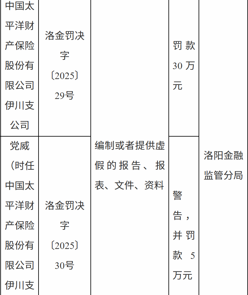 10月30日,国家金融监督管理总局洛阳监管分局行政处罚信息公示表显示,中国太平洋财产保险股份有限公司伊川支公司因编制或者提供虚假的报告、报表、文件、资料被罚款30万元;责任人党某被警告,并罚款5万元。