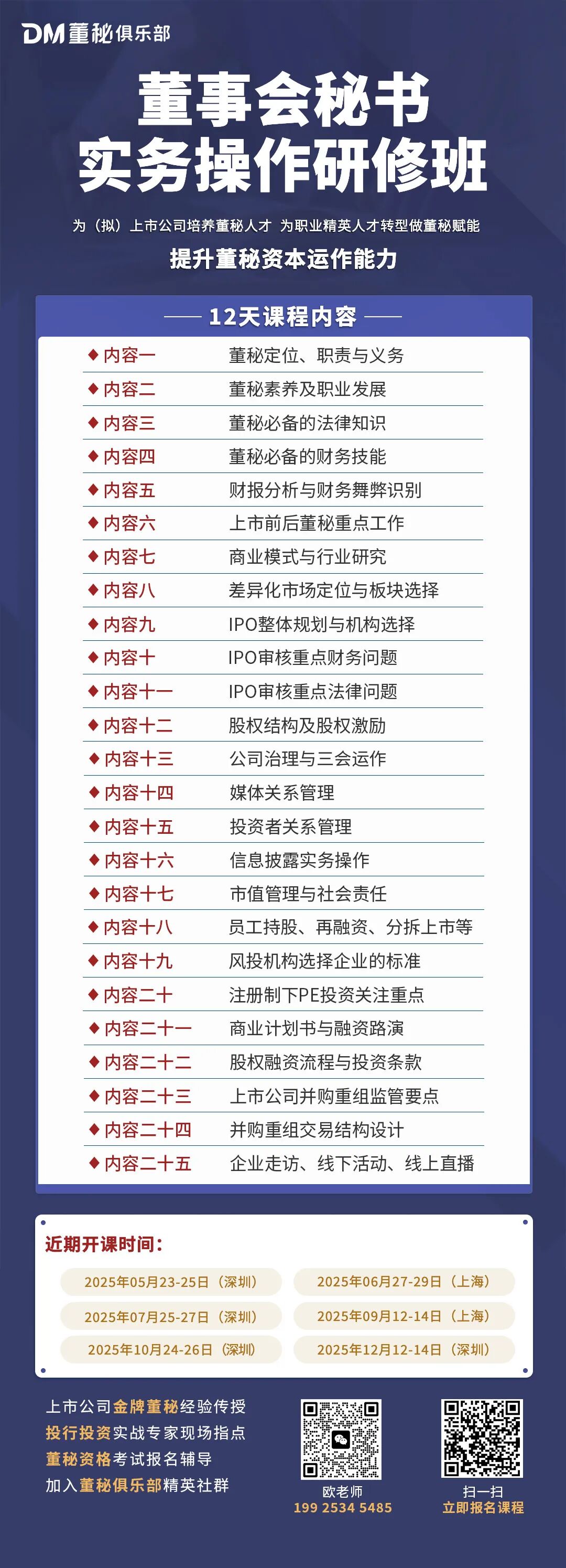]article_adlist-->如果你的企业也在准备上市,却在IPO材料准备、问询应对、规则理解上有困惑;或者你是董秘/证代,想提升自己的IPO实战能力——那么董秘俱乐部提供了一个很好的“补短板、避坑、链接资源”机会,我们的线下课程《董秘实务操作研修班》由资深董秘和行业专家授课,内容涵盖IPO上市、投资者关系管理、资本运作等核心技能,通过案例分析、模拟路演等实战训练,帮助学员快速掌握董秘工作要点。