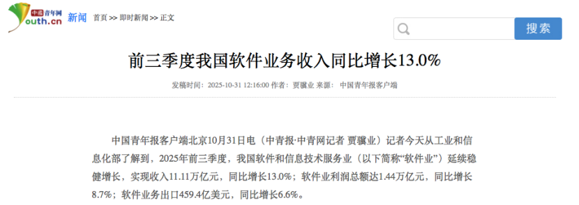 中国青年报客户端北京10月31日电(中青报·中青网记者贾骥业)记者今天从工业和信息化部了解到,2025年前三季度,我国软件和信息技术服务业(以下简称“软件业”)延续稳健增长,实现收入11.11万亿元,同比增长13.0%;软件业利润总额达1.44万亿元,同比增长8.7%;软件业务出口459.4亿美元,同比增长6.6%。